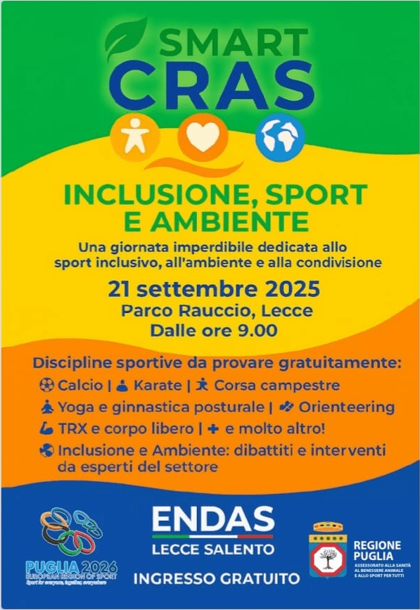 Il 21 settembre 2025 il Parco di Rauccio a Lecce ospita SMART CRAS, una giornata dedicata a sport inclusivo, ambiente e socialità.